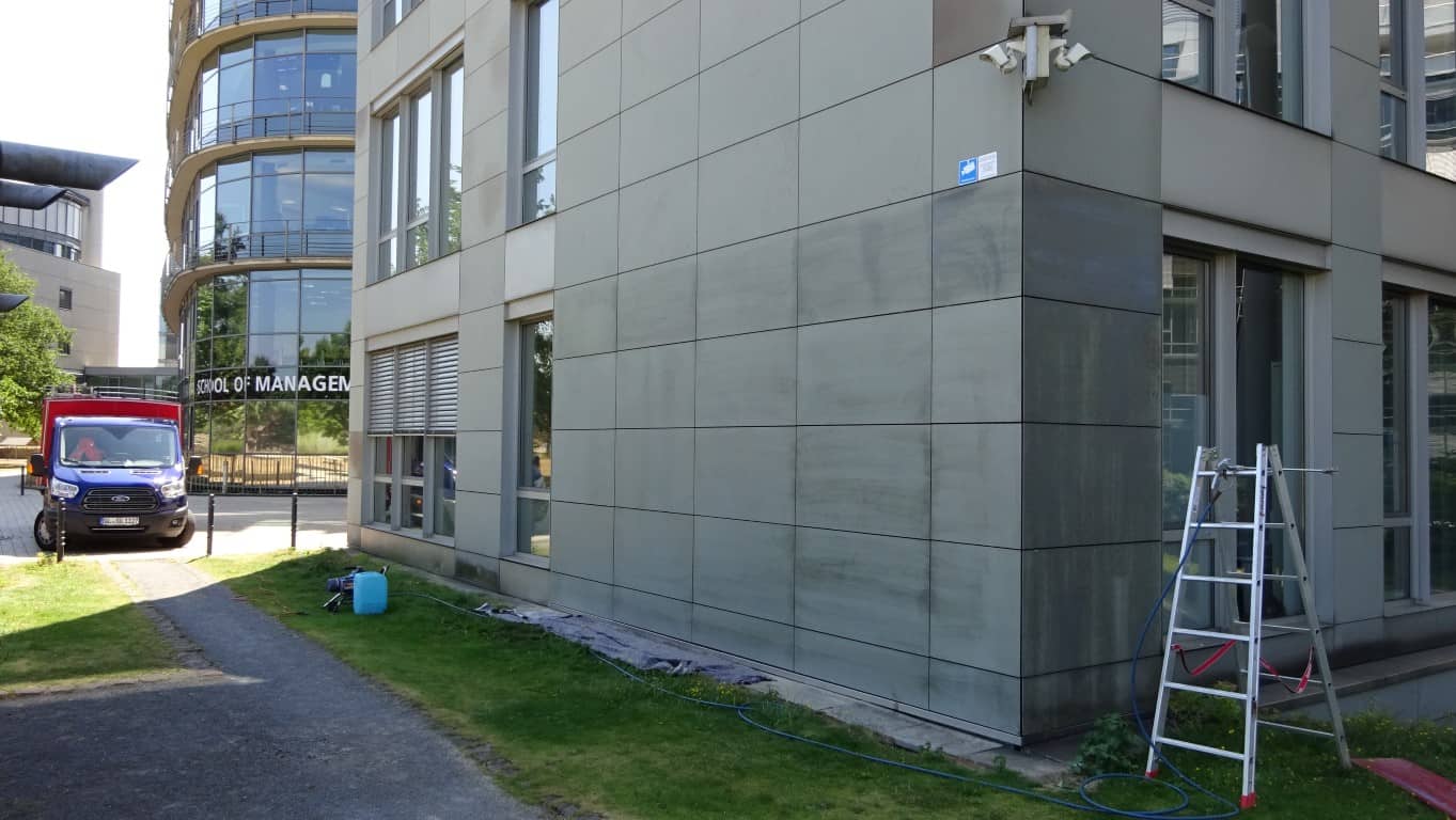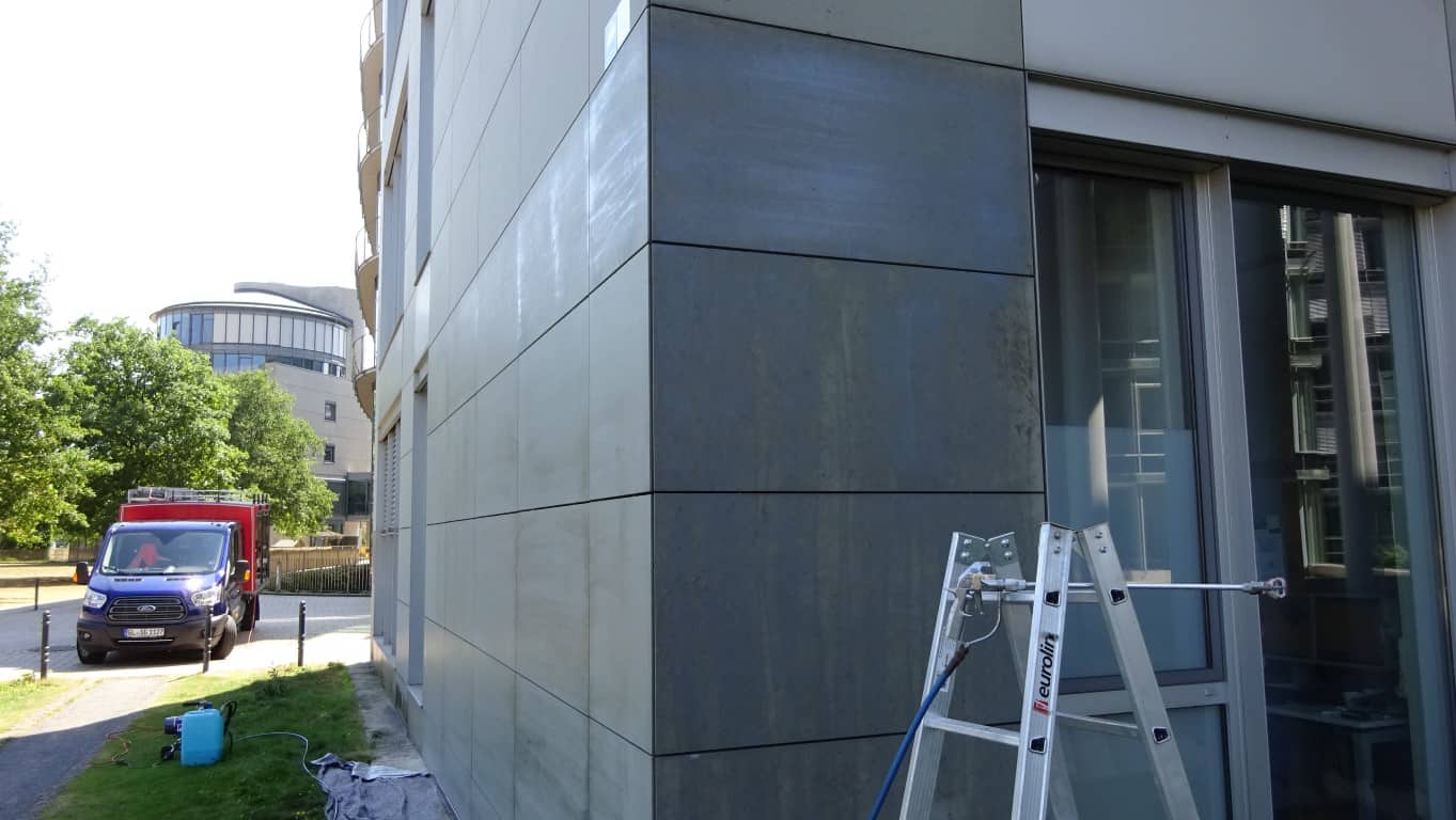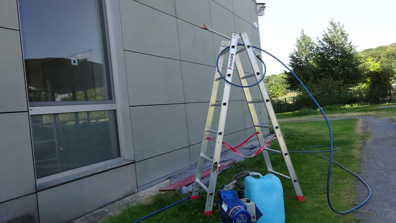 Transparenter Präventivschutz der Oberflächen mit einer Opferbeschichtung auf Wachsbasis. Das temporäre Graffitischutzsystem ist eine Opferschicht auf Basis von wasserdampfdurchlässigen Microwachsen. Farben und Schmutz bleiben an der Opferschicht hängen. Verunreinigte Flächen können einfach mit heißem Wasser und einem Hochdruckreiniger gesäubert werden. Da es sich um einen temporären Schutzfilm handelt, muss die gesäuberte Fläche nachgeschützt werden.