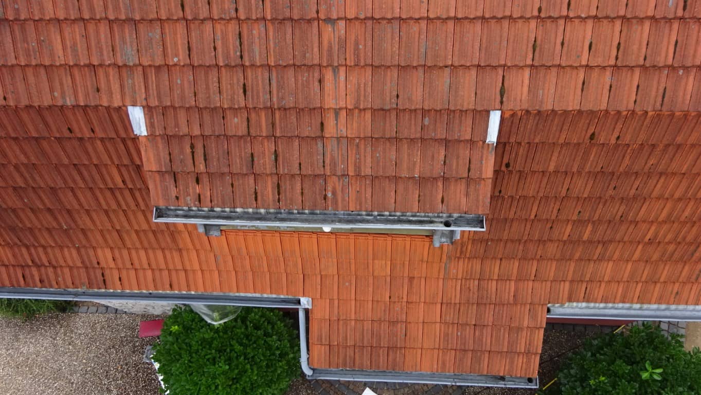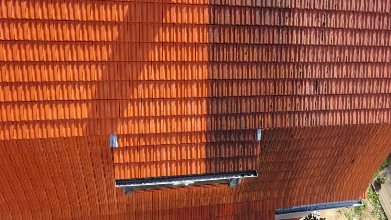 Durch natürliche Bewitterung und Umwelteinflüsse ist diese Dacheindeckung im Laufe von Jahrzehnten stark gealtert. Besonders starke Vermoosungen sorgten trotz der hohen Dachneigung dafür, dass es regelmäßig zu Stauungen und schlechtem Wasserabfluss auf den Dachflächen kam. Eigentlich ist dann gängige Praxis, die alte Dacheindeckung komplett gegen eine neue Dacheindeckung zu tauschen. Die Eigentümerin jedoch hat sich Dank einer Testfläche davon überzeugt, dass wir mit unseren Geräten und Produkten und einer einzigartigen Reinigungstechnik den gleichen Effekt erzielen, wie der einer neuen Dacheindeckung: Allerdings wesentlich preiswerter und umweltschonender. Zuerst wurde die Dacheindeckung ausführlich auf schadhafte Stellen untersucht und diese instandgesetzt. In der Regel hat jeder Eigentümer zu diesem Zweck noch in paar Ziegel bevorratet. Dann wurde mit Hilfe einer speziellen Schmutzkrake und einem umweltfreundlichen Reinigungsmittel das Dach komplett gesäubert. Abschließend wurden die Ziegel mit einem biologischen Produkt langzeitimprägniert.