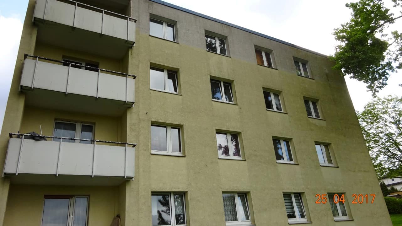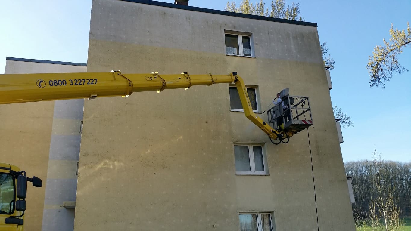 Die Fassade wurde mit einem verdünnten, zertifizierten Algen- und Schimmelpilzentferner zur Flächendesinfektion eingesprüht. Nach einer Einwirkzeit haben wir die Fassade mit einem Heißwasser-Hochdruckreiniger wieder abgespült. Das Schmutzwasser wurde in einem Auffangbecken aufgefangen, in einem Behälter filtriert und anschließend fachgerecht entsorgt.