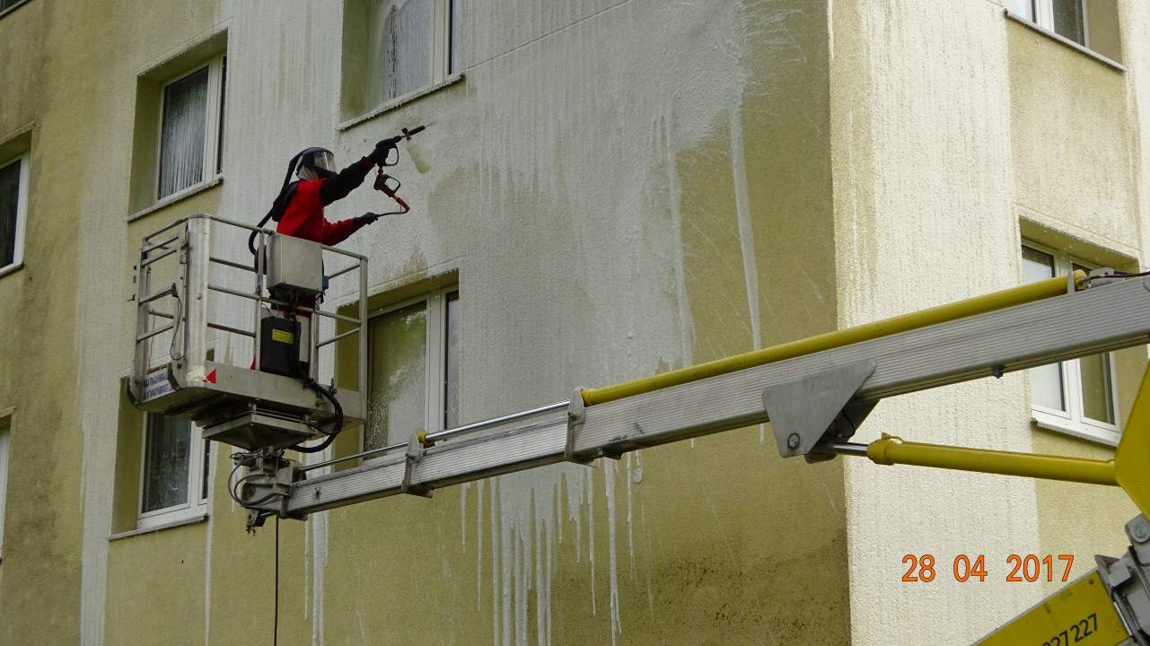 Fassadenreinigung im Heißwasserstrahlverfahren mittels einem Algenentferner.