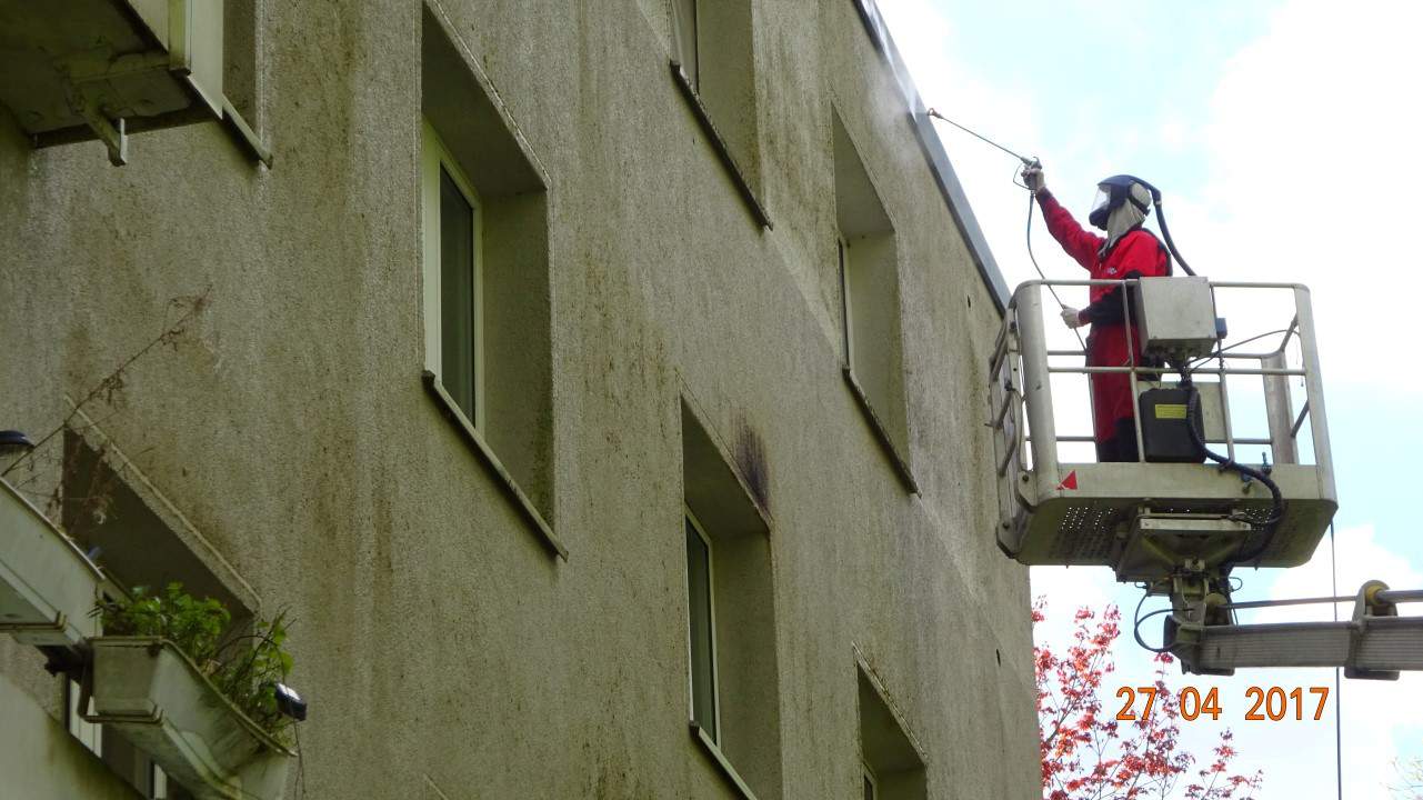 Fassadenreinigung im Heißwasserstrahlverfahren mittels einem Algenentferner.
