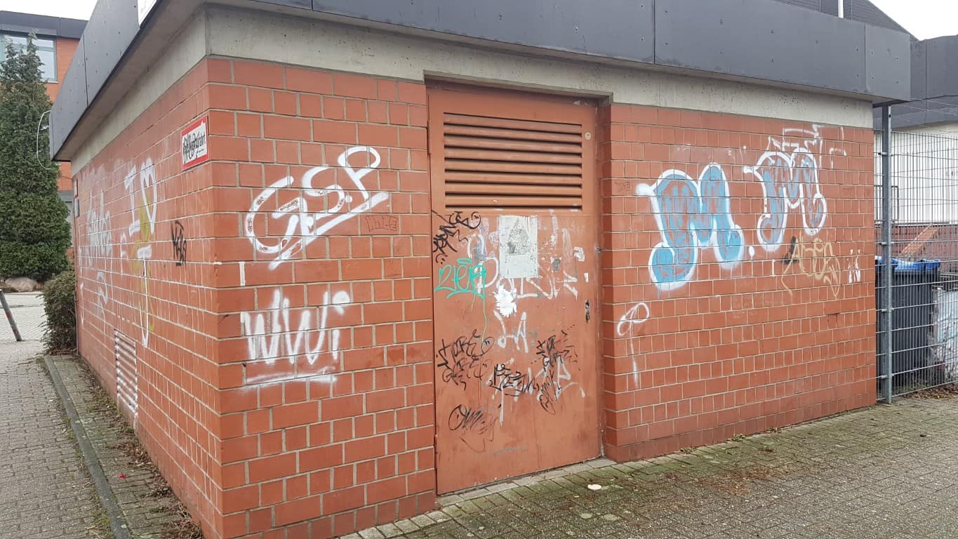 Es handelt sich um einen Klinkerbau (Schulzentrum) aus den Ende der achtziger Jahren. Die Graffitis befanden sich schon seit mehreren Jahren auf den Klinkersteinen. Das erschwert die Entfernung, denn durch langjährige UV-Bestrahlung und den ungeschützten Untergrund sind die Graffitis stark in den Stein eingezogen.