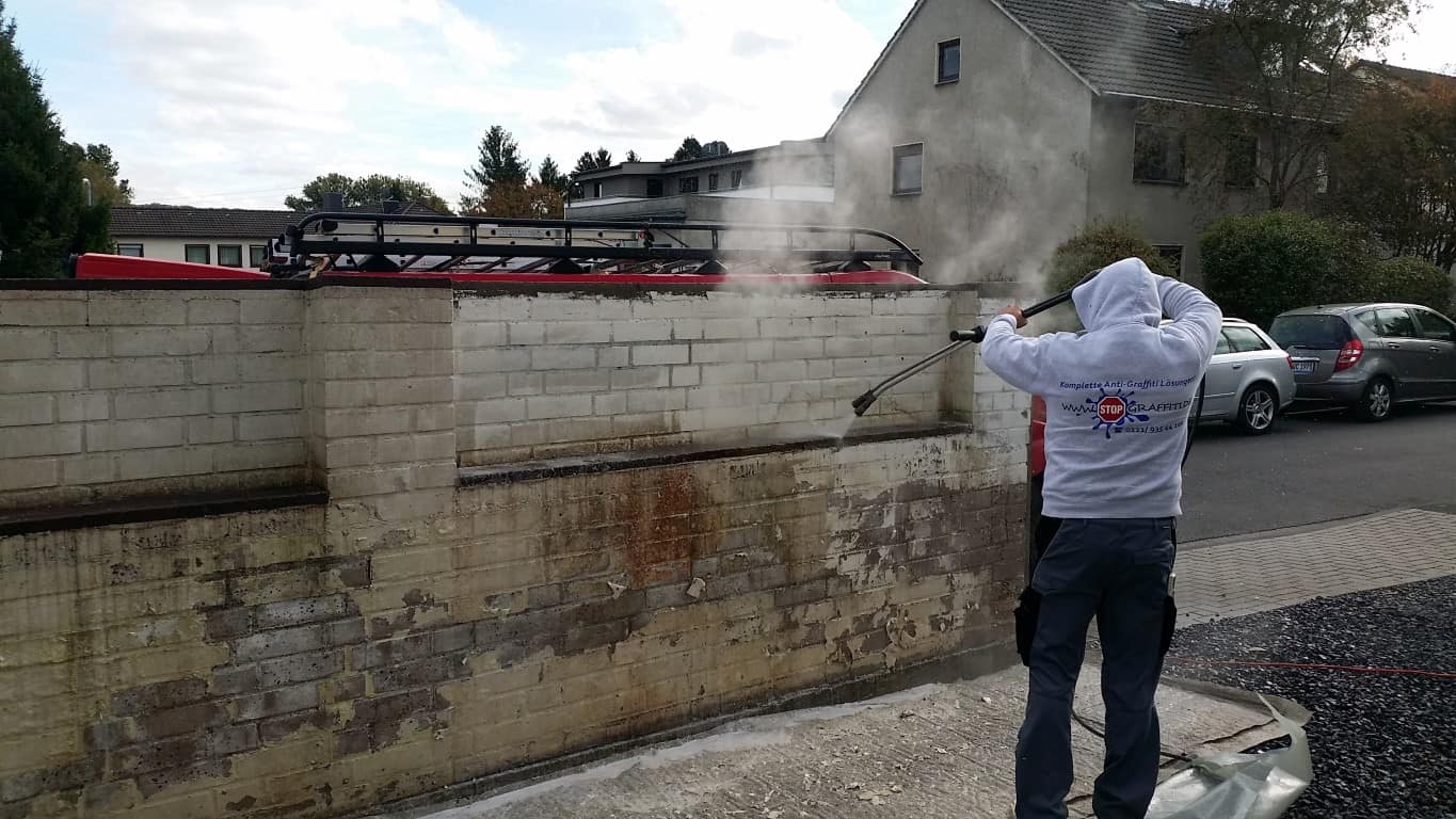Klinkermauer Abbeizen und permanenter Graffitischutz mit 2K Antigraffitibeschichtung in Siegburg