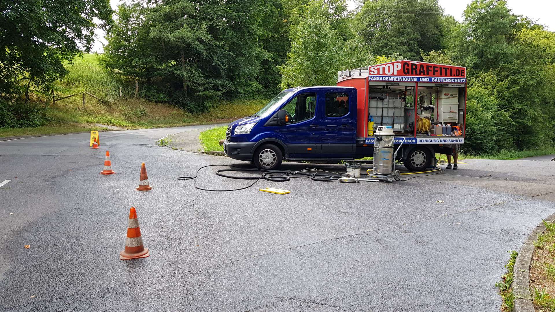 In Lohmar haben wir erfolgreich eine großflächige Fahrbahnschmiererei entfernt, die durch eine lange Spur von Ölfarbe gekennzeichnet war und dringend einer umweltfreundlichen Lösung bedurfte. Unsere innovative Technik und die Verwendung biologisch abbaubarer Graffitireiniger ermöglichten es uns, die Verschmutzung effizient zu beseitigen, während unser ökologisches Abwassersystem dafür sorgte, dass alle Rückstände aufgefangen, filtriert und aufbereitet wurden. Dabei legten wir besonderen Wert darauf, die Fahrbahn unbeschädigt zu lassen und die Sicherheit im Straßenverkehr zu gewährleisten, ohne aggressive Reinigungsmethoden anzuwenden, die ein Risiko für die Fahrbahnbenutzer darstellt.