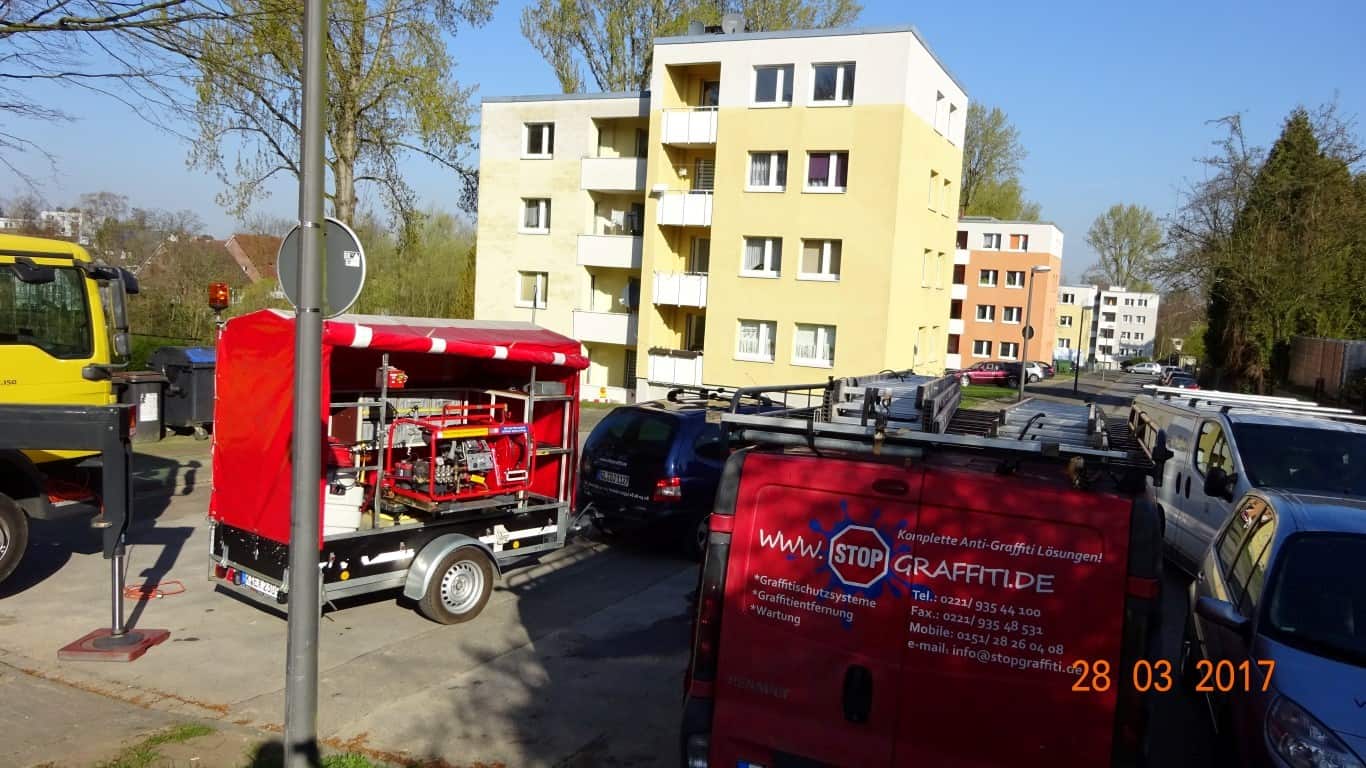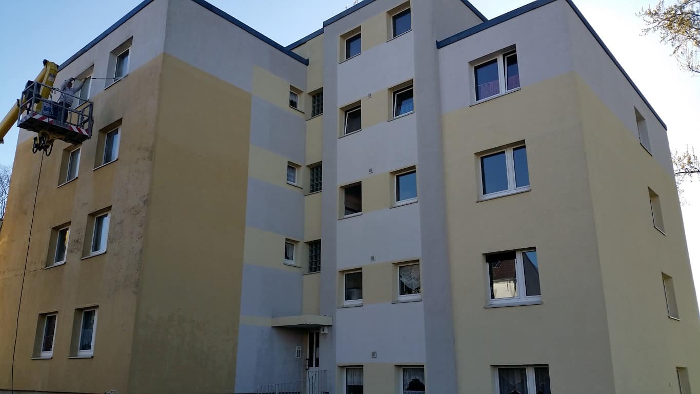 Die Fassade wurde mit einem verdünnten, zertifizierten Algen- und Schimmelpilzentferner zur Flächendesinfektion eingesprüht. Nach einer Einwirkzeit haben wir die Fassade mit einem Heißwasser-Hochdruckreiniger wieder abgespült. Das Schmutzwasser wurde in einem Auffangbecken aufgefangen, in einem Behälter filtriert und anschließend fachgerecht entsorgt.