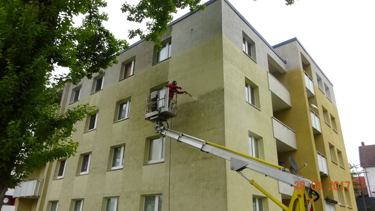 Fassadenreinigung im Heißwasserstrahlverfahren mittels einem Algenentferner.