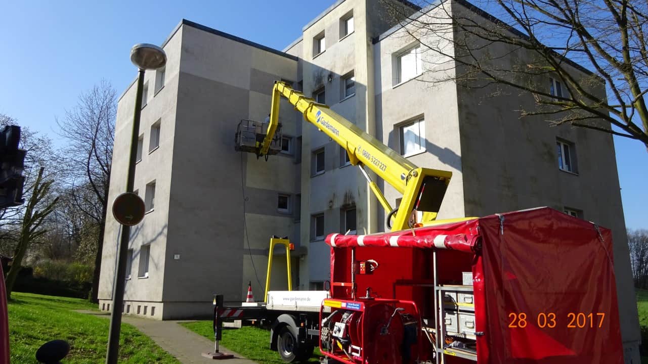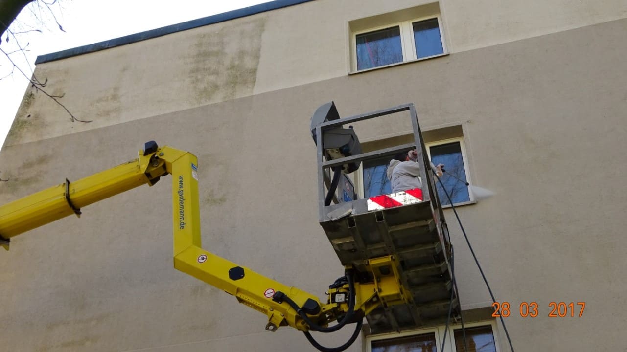 Die Fassade wurde mit einem verdünnten, zertifizierten Algen- und Schimmelpilzentferner zur Flächendesinfektion eingesprüht. Nach einer Einwirkzeit haben wir die Fassade mit einem Heißwasser-Hochdruckreiniger wieder abgespült. Das Schmutzwasser wurde in einem Auffangbecken aufgefangen, in einem Behälter filtriert und anschließend fachgerecht entsorgt.