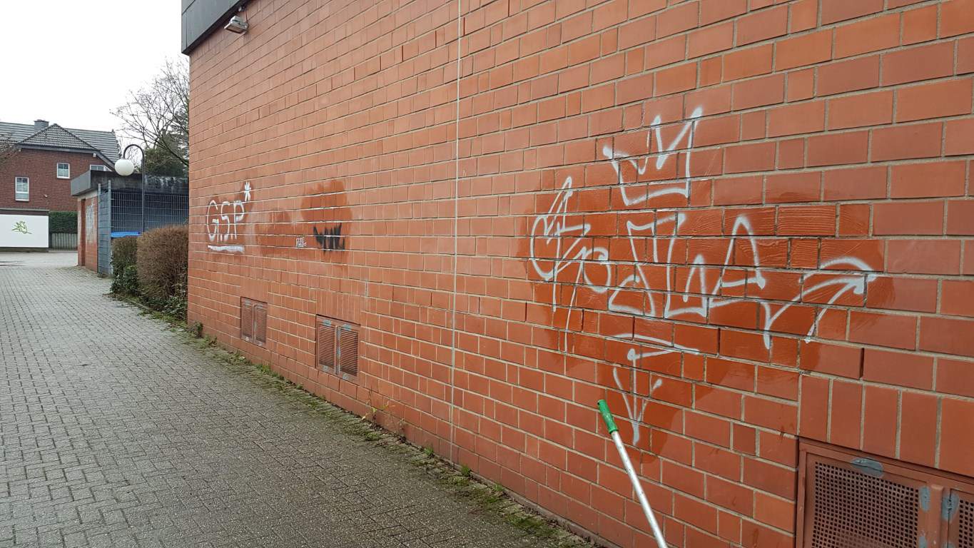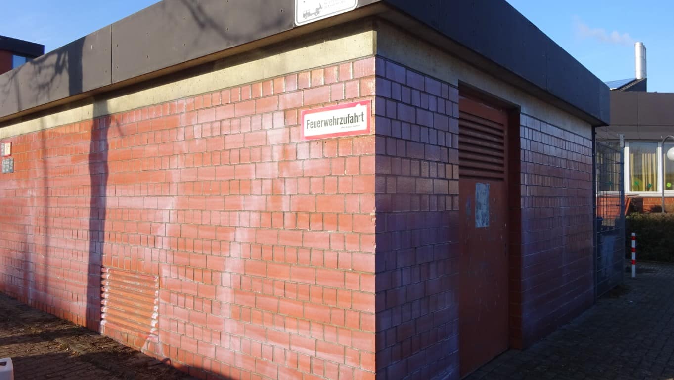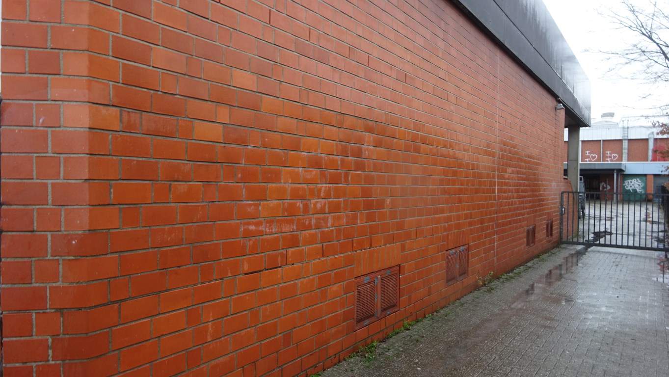 Es handelt sich um einen Klinkerbau (Schulzentrum) aus den Ende der achtziger Jahren. Die Graffitis befanden sich schon seit mehreren Jahren auf den Klinkersteinen. Das erschwert die Entfernung, denn durch langjährige UV-Bestrahlung und den ungeschützten Untergrund sind die Graffitis stark in den Stein eingezogen.